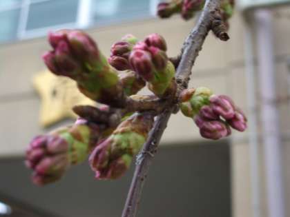 体育館南側,紫竹通りに面したソメイヨシノが数輪開花しました。名木100選のソメイヨシノや本館東側,中庭のソメイヨシノはつぼみは膨らんできているものの,まだちょっと時間がかかるかもしれません。入学式が心配になってきました。