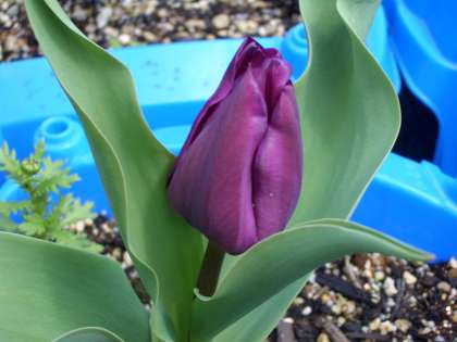 新2年生が育てているチューリップ,紫色の花が間もなく咲きそうです。