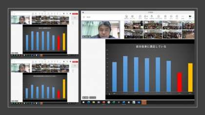 他国や日本と、本校高学年の結果を比較しながら、子どもたちのがんばりを伝えました。際立って主体的で積極性のある高学年の姿が、グラフからよく分かり、子どもたちにとっても励みになったと思います。(グラフの黄色が本校児童、赤が日本です)