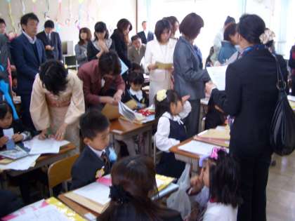 記念撮影の後,各教室で先生のお話を聞き,配り物の中や教科書をお家の方と一緒に見ています。