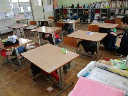 音が聞こえると、全員すばやく机の下に入り、身を守る行動を取ることができ、花マルの一次避難でした。