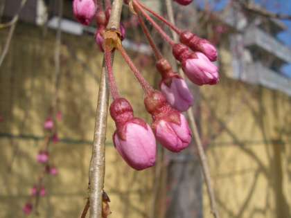 枝垂れ桜のつぼみも結構膨らんできました。月曜日には咲き始めるかな。