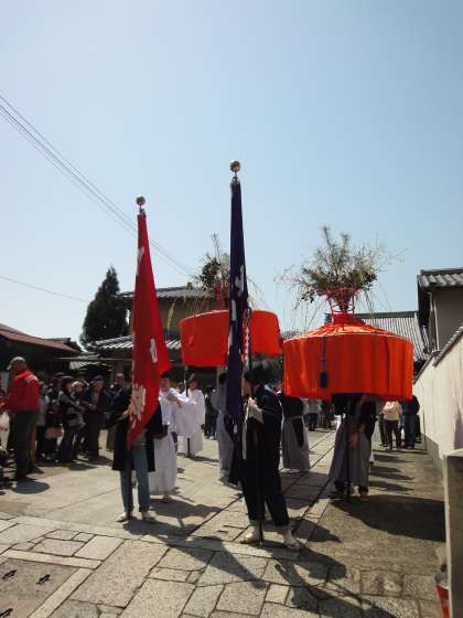 桜の花が散る頃,疫神は花の精にあおられていたずらをして回ると云われます。疫病の源はここにあるのです。祭りの中心はたくさんの生花で飾られた大きな赤い花傘(はながさ)です。やすらい踊りで花傘に惹き寄せられた疫神は疫社へと鎮められ一年の無病息災が祈られるのです。
