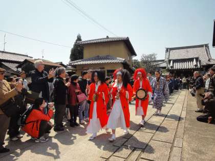 赤毛・黒毛の鬼たちが,笛や太鼓のお囃子(はやし)に合わせて,長い髪を振り乱しながら踊ります。「やすらい花や」の掛け声とともに,祭りの列が町を練り歩き人々の健康を祈る伝統のお祭です。