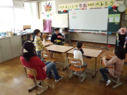 4人のお友だちと2人の先生で新学期が始まりました。みんな仲良く,楽しい学校生活をおくろうね。
