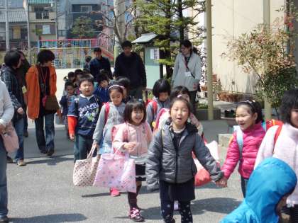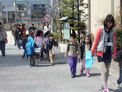 1年生はしばらくの間,黄コース,赤コース,緑コース,青コースの4つにわかれて集団下校をします。安全に気をつけて帰りましょうね。お手伝いいただいているPTAのみなさん,ありがとうございます。