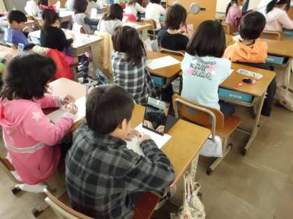 鏡で自分の顔を見ながら,画用紙に笑顔を描いています。さて,どんな笑顔でいっぱいになるでしょう。