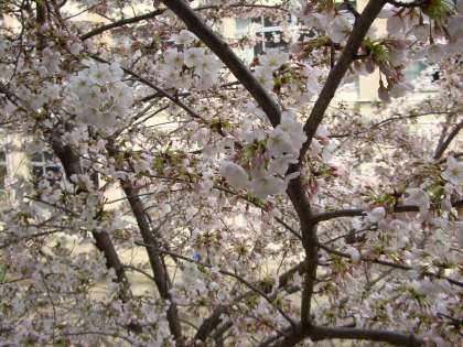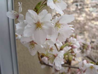 中庭のソメイヨシノが満開に近くなってきています。2階の窓を開けると,桜がすぐ目の前に広がっています。