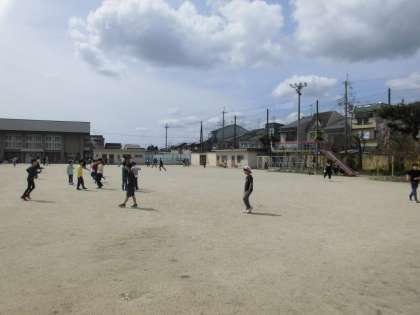 青空の下でみんな元気いっぱいに遊んだり,お話をしたりして楽しみました。サクラの花びらが風にとばされて,とてもきれいでした。