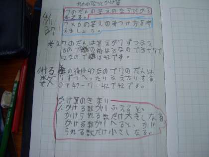 九九の表を用いた活動を通して,九九の表の縦や横の数の増え方から九九のきまりをみつける学習をしています。ノートもきれいの整理されて書かれています。