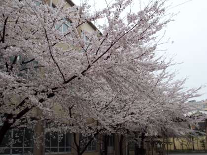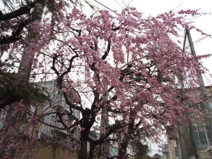 写真,上から紫竹通り側のソメイヨシノ,運動場西側の枝垂れ桜,中庭のソメイヨシノです。紫竹通り側,中庭のソメイヨシノは満開です。