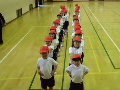 今日は初めての体育です。体育館で並び方の練習をしています。みんなしっかりできますね。