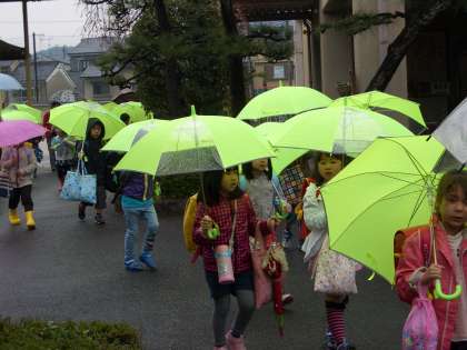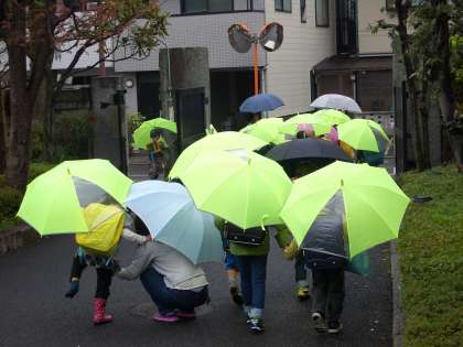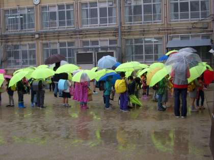 今日は朝から雨が降り続いています。1年生の下校時も雨です。傘の花が開きましたが,帰り道,十分気をつけて帰ってね。