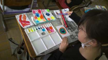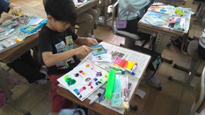 図画工作科「心のもよう」の学習で、自分の中にある心の様子を、様々な模様を組み合わせて表現しています。
