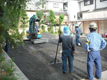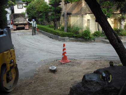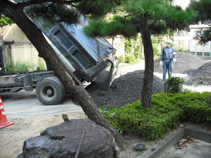 午後4時40分現在,掘り起こし整地した後に砂を入れ,そのあとバラスを敷いていきます。