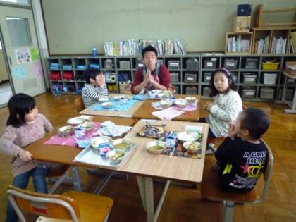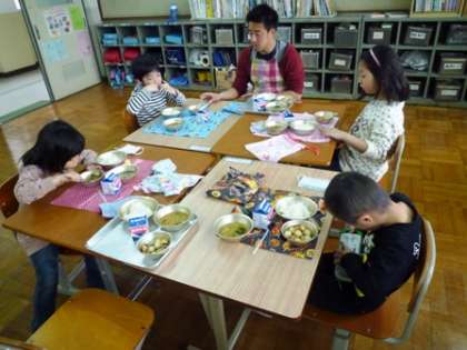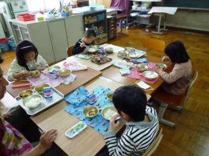 みんなで配膳ができたら,いよいよ「いただきます」です。今日は,T君が「いただきます」の合図係でした。今日の献立は,「ごはん,牛乳,プリプリ中華いため,ビーフンスープ」で,みんなで仲良くいただきました。