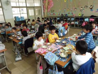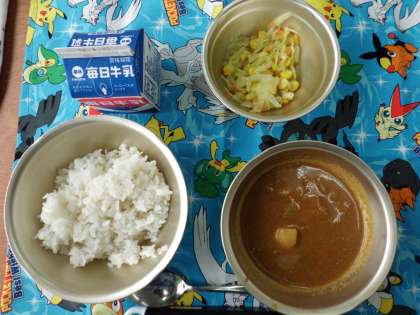 今日のメニューは大好きなカレーです。給食室から漂ってくる匂いで給食の時間が待ち遠しくてたまりませんでした。いただきます。