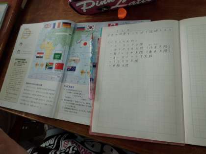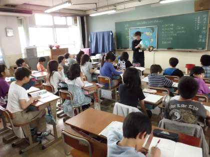 地球儀で地球の様子を見て見つけたこと思ったことを話しています。5年生の社会科では,まずはじめに地球の中の日本の国土について学習します。初めて出会うこともあります。地球儀や地図をしっかり見て学習しましょう。