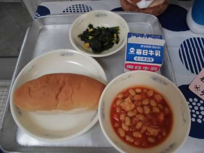 「みるくこっぺぱん・ぎゅうにゅう・だいずとけいにくのとまとに・ほうれんそうのそてえ」でした。みるくこっぺぱんに,とまとのあじがよくあいました。