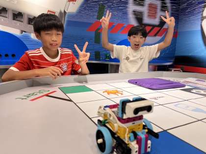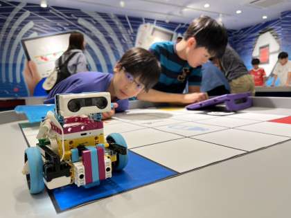 プログラミング体験では、自分たちの指令を送って、うまく動かせるように工夫しています。みんな笑顔で過ごしています。