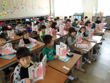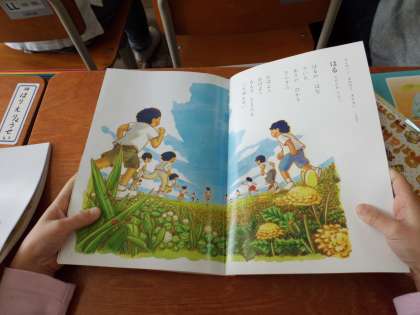 「はる」の詩を,先生のあとについて読んだり,みんなで一斉に読んだりして,絵の中の子どもたちがどんな会話をしているかを想像し,イメージを膨らませて話しあいます。