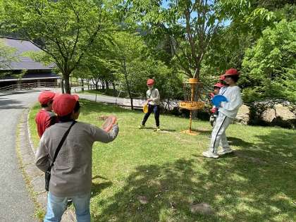 ゴールをめがけて投げます。みんなでアドバイスを出し合いながら頑張ります。