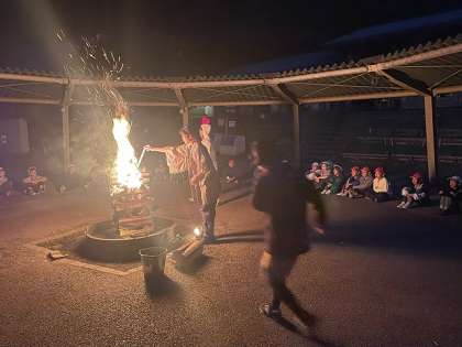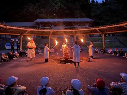 いよいよまちにまったキャンプファイヤー 花背に住む火の神から「友情・努力・希望」などの火を,火の子たちが唱えた誓いの言葉とともにいただきました。神は火をささげるとかえって行きました。