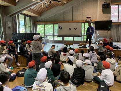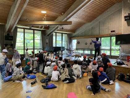 あいにく少し雨が降ってきたので,ネイチャービンゴは早めに切り上げました。山の家の先生が,花背の自然についてお話しをしてくださりました。野生動物についてなど,みんな興味津々でした。