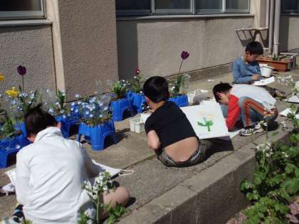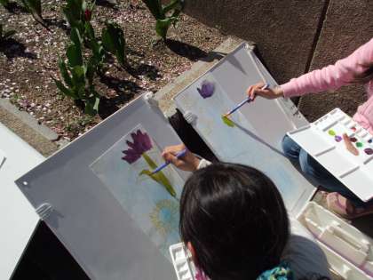先日下絵を描いたチューリップに絵の具で色をつけていきます。色の出し方も気をつけないと濁ってしまいます。実際に比べながら色を作りだしています。