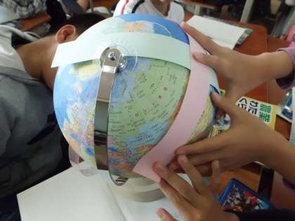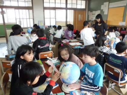 グループごとに地球儀を使って日本と世界の位置関係を調べています。地球は丸いことは分かっていても,実際に地球儀を手にしてみてみると新しい発見がありますね。