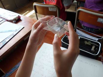 2つの直方体の大きさを比べます。面積ならわかるのですが,立体になったことで,どのような比べ方ができるのか,ちょっと苦労しています。
