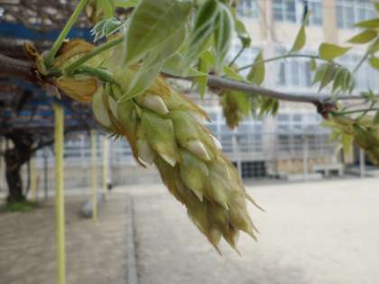 今年も白藤がたくさんのつぼみをつけています。一気に咲くと,真っ白に染まることでしょう。