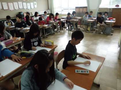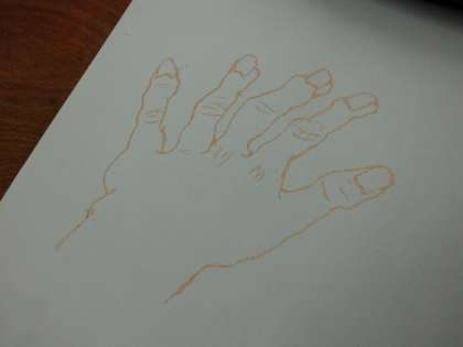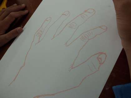 クロッキーで自分の手を描いています。自分の手をしっかり見ながら特徴をとらえて描いています。画用紙ばかり見て描くと一般的な手の概念でしか描けません。集中力が必要です。