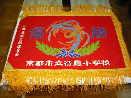 先日のホームページで優勝旗のデザインが決まったことをお知らせいたしましたが,今日,優勝旗が出来上がってきました。待鳳小学校らしく,中心に鳳を配した深紅の優勝旗です。子どもたちも,新しい優勝旗を目指して頑張ることでしょう。秋の運動会で,地域の皆様に披露させていただきます。地域の皆様,本当にありがとうございました。