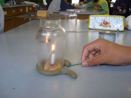 ろうそくをびんの中に入れて燃え続けさせるには,どうしたらよいだろうかという課題にそって,隙間の開け方を変えたときのろうそくの燃え方や空気の流れを線香の煙などを使って確かめています。