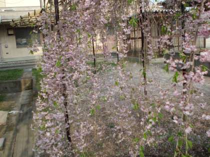 体育館横の枝垂れ桜の様子です。花びらも結構散ってきています。本日にて桜だよりを終了いたします。変化があった時に掲載していきます。