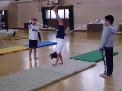 「マット運動」の学習です。今できる技で連続技や組み合わせ技に挑戦したり,新しい技に挑戦したりして楽しむことができる学習をしています。