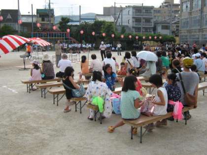 午後5時,まだ日差しが暑い中,待鳳まつり始まりました。最初は,待鳳保育園の年長組さんのかわいい歌です。