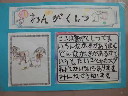 2年生は,今日の学校探検のために教室や部屋の案内板を作っていました。この案内板は1年間ずっと貼られています。