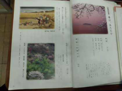 伝統的な言語文化と国語の特質に関する事項の学習です。「春」を題材にした4編の詩や短歌・俳句と解説を読み,昔の人のものの見方や感じ方について,今と比べています。