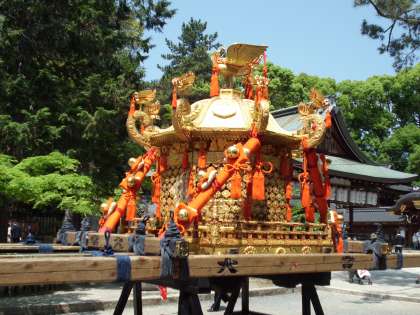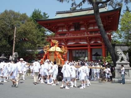 神輿が組みあがりました。神輿を今宮神社の門前に据えられました。
