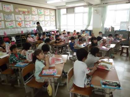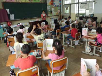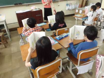国語の時間の初めに,前に学習した「うたに あわせて あいうえお」を読んでいます。正しい姿勢でリズミカルに音読しています。読むことが基本です。