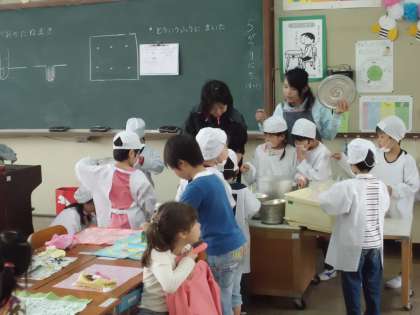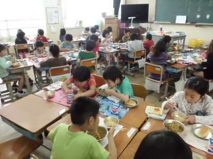 今日の給食はソース焼きそばです。麺類がつくのでパンは小型コッペパンです。それとじゃがいものピリカラいためと牛乳です。ソース焼きそばは大人気です。