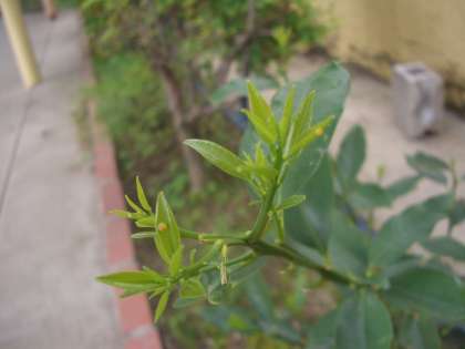 キンカンの葉にアゲハの卵を見つけました。新芽に産みつけています。幼虫になったとき,食べやすいように柔らかい葉に産んでいるのですね。