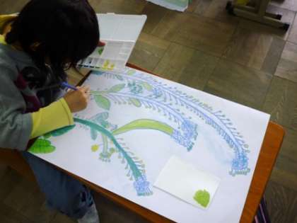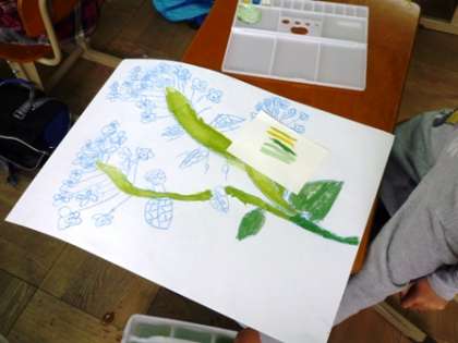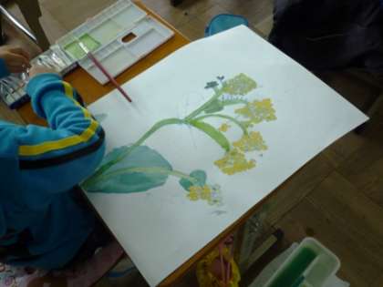 下書きをしていた菜の花の絵に,色を塗りました。2〜3色の絵の具を混ぜて,綺麗な色を作って丁寧に塗りました。