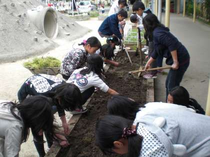 園芸委員会が野菜の苗を花壇に植えました。雑草を抜いたり花壇を耕したりした後,キュウリやカボチャ,ピーナッツ,トウコロモシなどの苗を植えました。大きく立派に育ててくださいね。