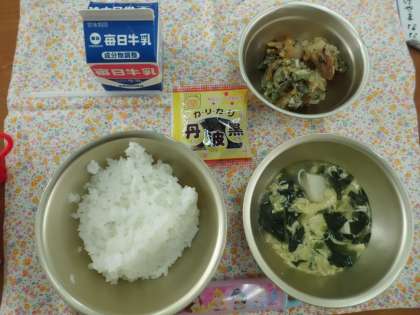 今日の給食は,ごはん・かきあげ・かきたま汁・牛乳・黒大豆です。残さずおいしく食べようね。