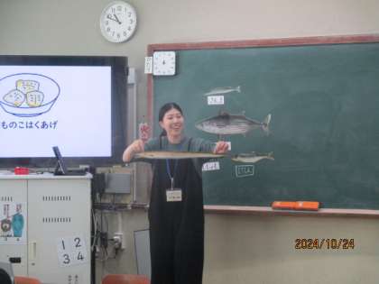 栄養教諭の先生に、1年生の子どもたちに食の指導をしていただきました。海に住んでいるいろいろな魚の紹介や、魚に含まれる栄養素のお話をしていただきました。