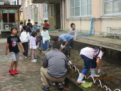 2年生が、冬野菜を植える準備のため畑の整備をしました。畑に生えている雑草をみんなでがんばって抜きました。ゲストティーチャーの方にも、お手伝いをしていただきました。