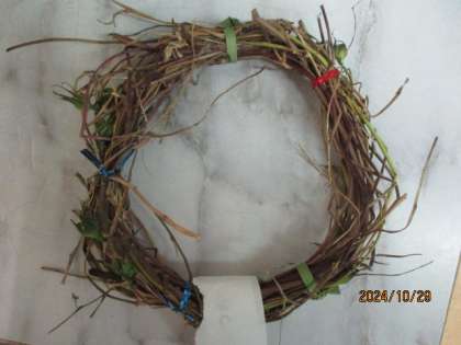 1年生が、朝顔のつるを使ってリース作りをしました。朝顔のつるがからんで、なかなかほどくのが大変でしたが、みんな上手にリースを完成させることができました。